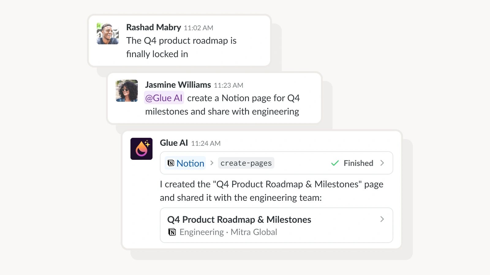 Glue + Notion through MCP helps teams capture information before it slips away. Documentation happens alongside collaboration, not as a separate chore.
