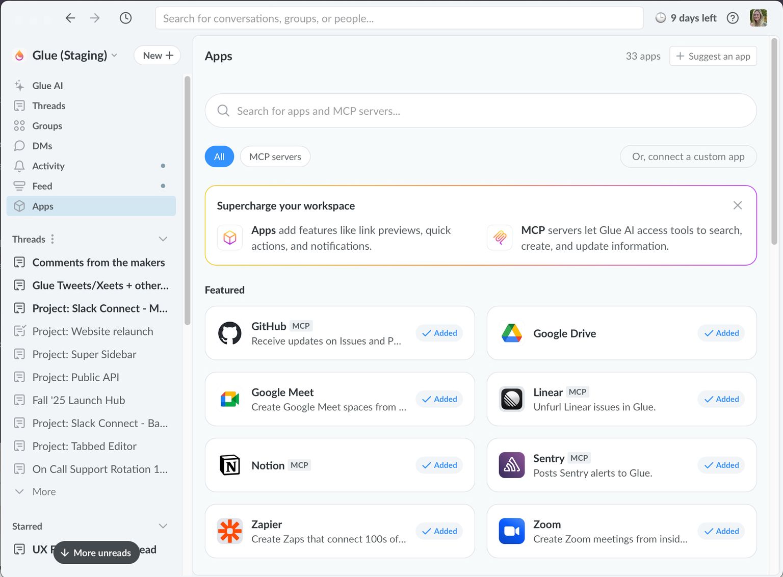 MCP servers are installed workspace-wide, so you configure once and everyone on your team benefits. Glue AI acts as the client, sending requests to MCP servers that your connected apps expose.